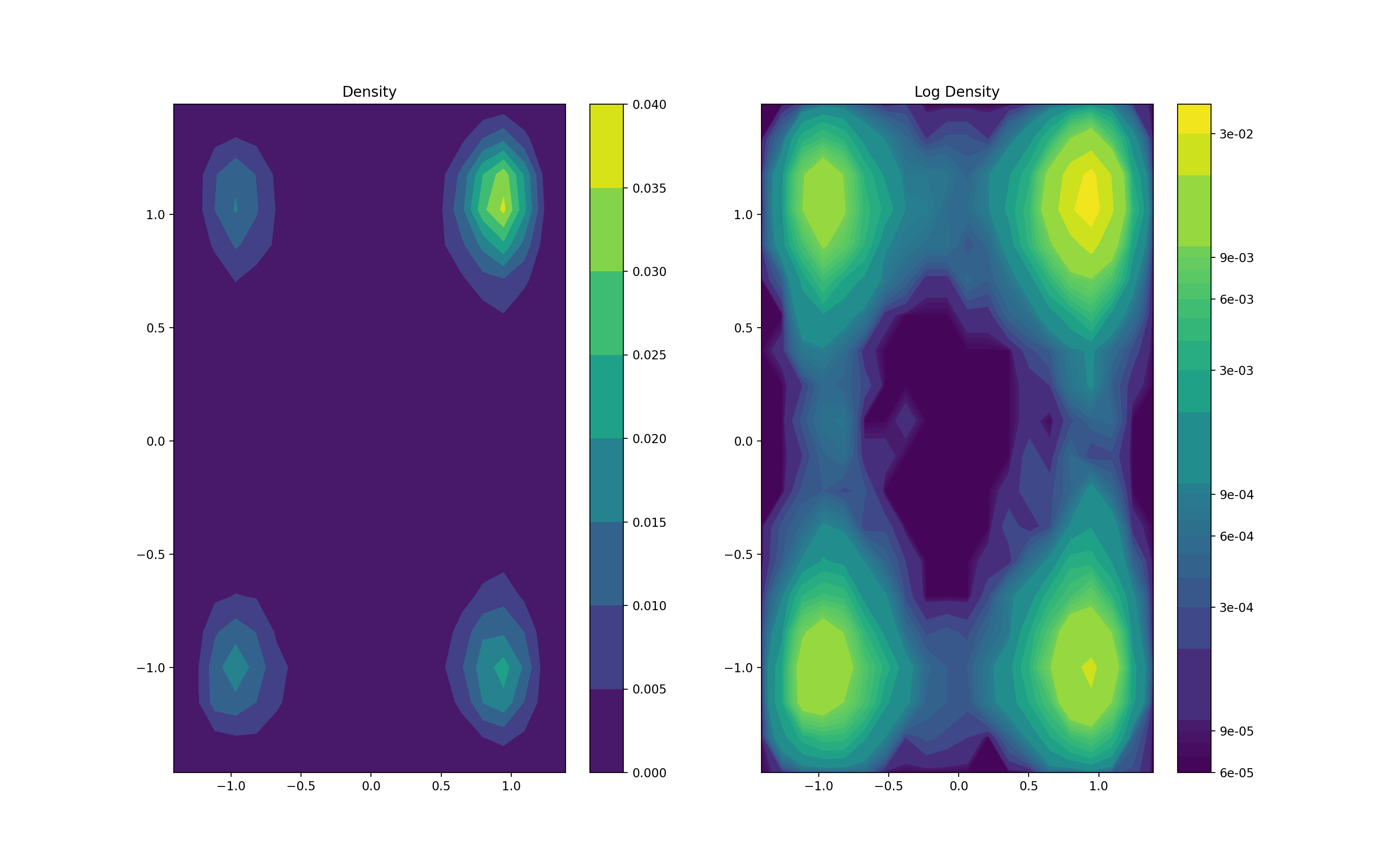 - deeptime.plots.plot_density(x, y, n_bins=100, weights=None, avoid_zero_counts=False, contourf_kws=None, ax=None)¶