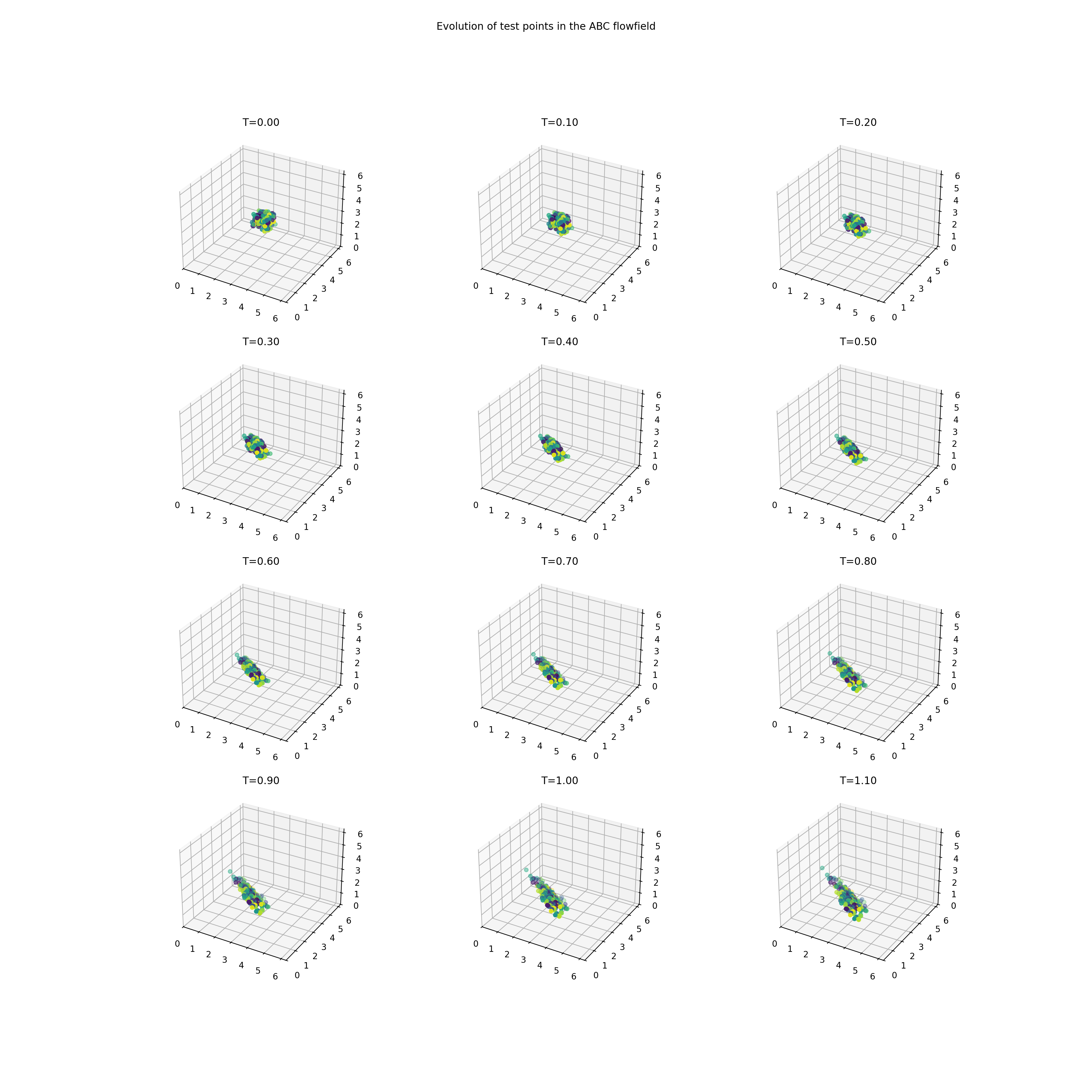 \[\begin{aligned} \dot{x} &= A\sin(z) + C\cos(y)\\ \dot{y} &= B\sin(x) + A\cos(z)\\ \dot{z} &= C\sin(y) + B\cos(x) \end{aligned}\]on the domain \(\Omega=[0, 2\pi]^3\) with the parameters \(A=\sqrt{3}\), \(B=\sqrt{2}\), and \(C=1\).