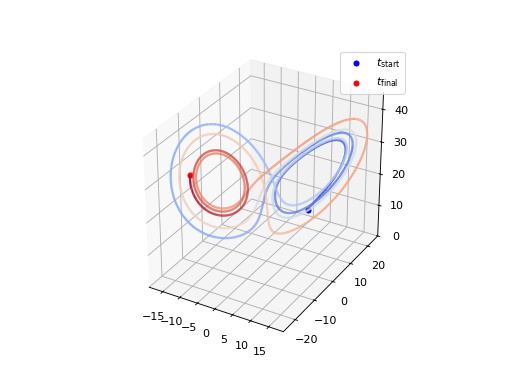 \[\begin{aligned} \dot{x} &= \sigma (y - x)\\ \dot{y} &= x(\rho - z) - y \\ \dot{z} &= xy - \beta z \end{aligned}\]with \(\sigma = 10\), \(\beta = 8/3\), and \(\rho = 28\).