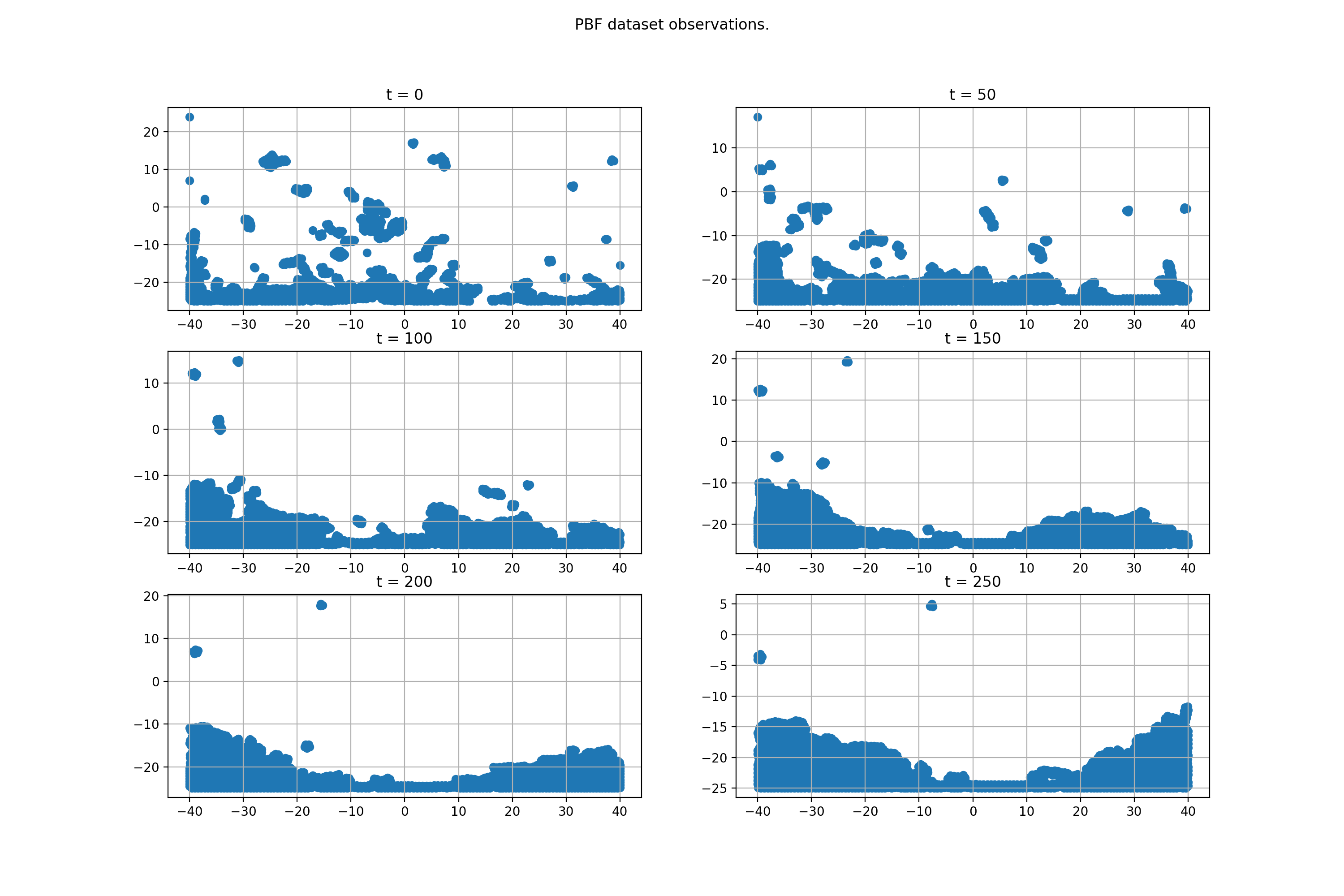 The simulation box has dimensions \([-40, 40]\times [-25, 25]\) and the initial positions of the particles are around the top boundary of the box. For simplicity of use, the initial positions are fixed in this method and yield 972 particles. For custom positioning, please use the simulator directly.