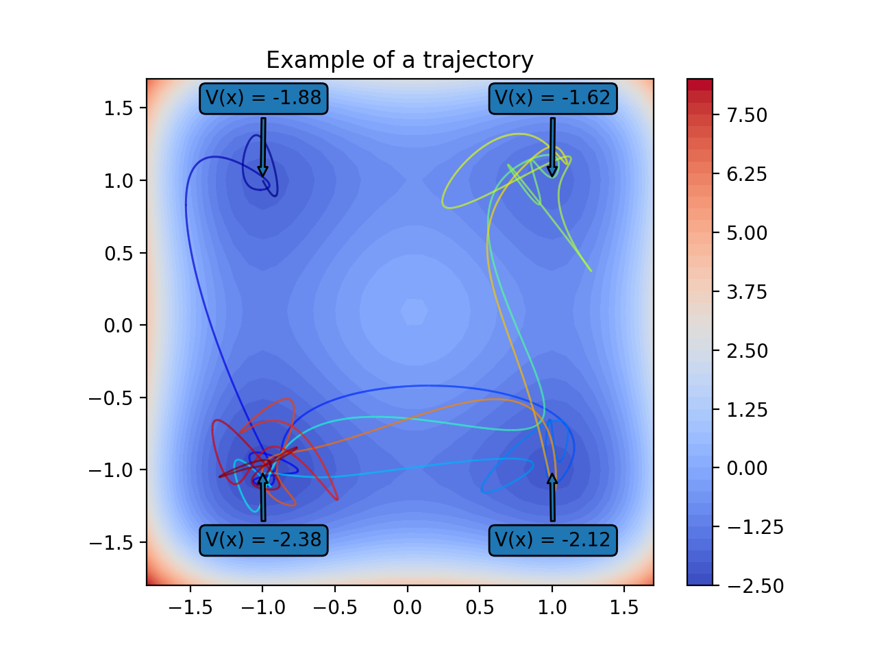 \[\mathrm{d}X_t = \nabla V(X_t) \mathrm{d}t + \sigma\mathrm{d}W_t\]with \(W_t\) being a Wiener process and the potential \(V\) being given by