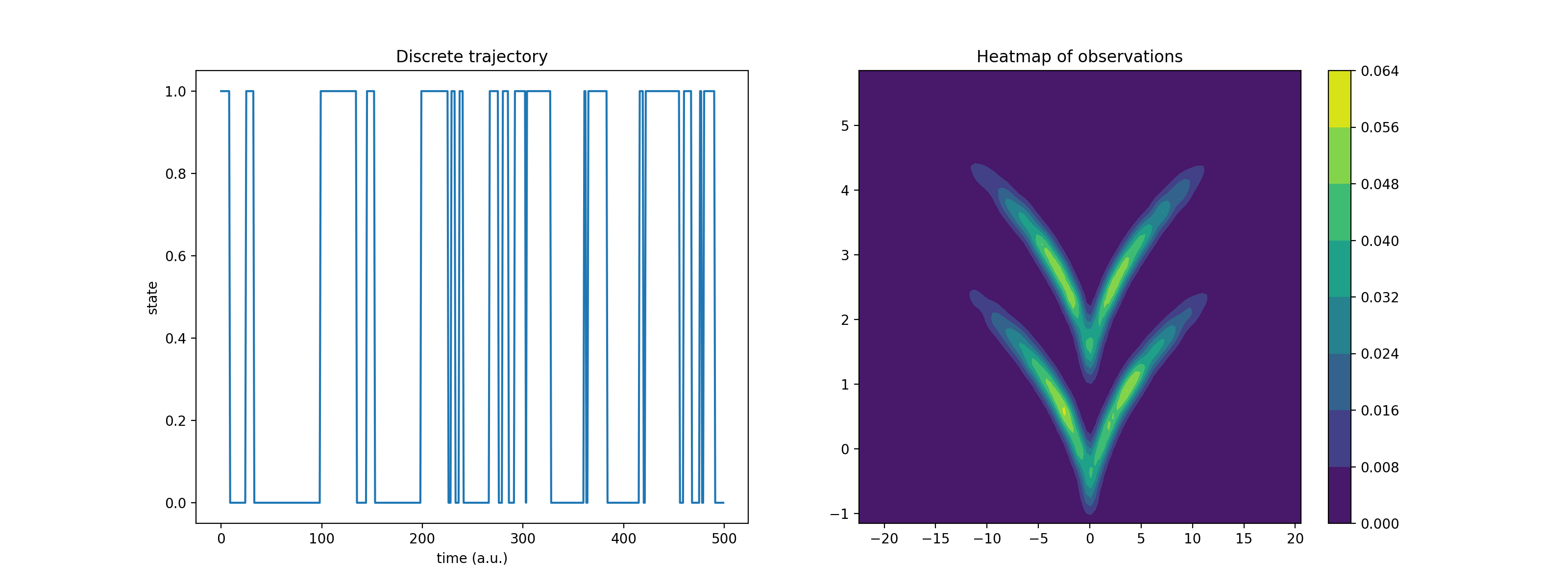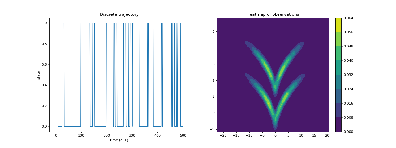\[P = \begin{pmatrix}0.95 & 0.05 \\ 0.05 & 0.95 \end{pmatrix}. \]The observations are generated via the means are \(\mu_0 = (0, 1)^\top\) and \(\mu_1= (0, -1)^\top\), respectively, as well as the covariance matrix