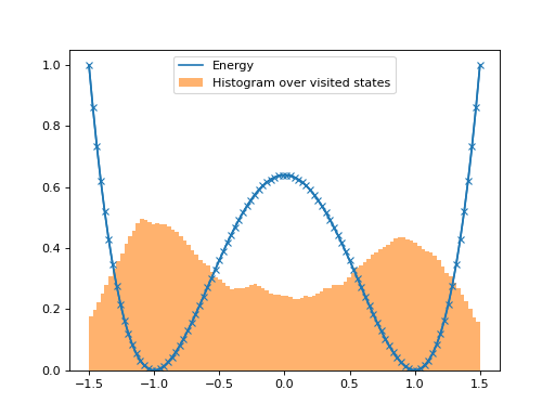 \[\begin{aligned} p_{i,i-1} &= 0.5 d \min \left\{ 1.0, \mathrm{e}^{-(E_{i-1} - E_i)} \right\}, \\ p_{i,i+1} &= 0.5 d \min \left\{ 1.0, \mathrm{e}^{-(E_{i+1} - E_i)} \right\}, \\ p_{i,i} &= 1.0 - p_{i,i-1} - p_{i,i+1}. \end{aligned}\]