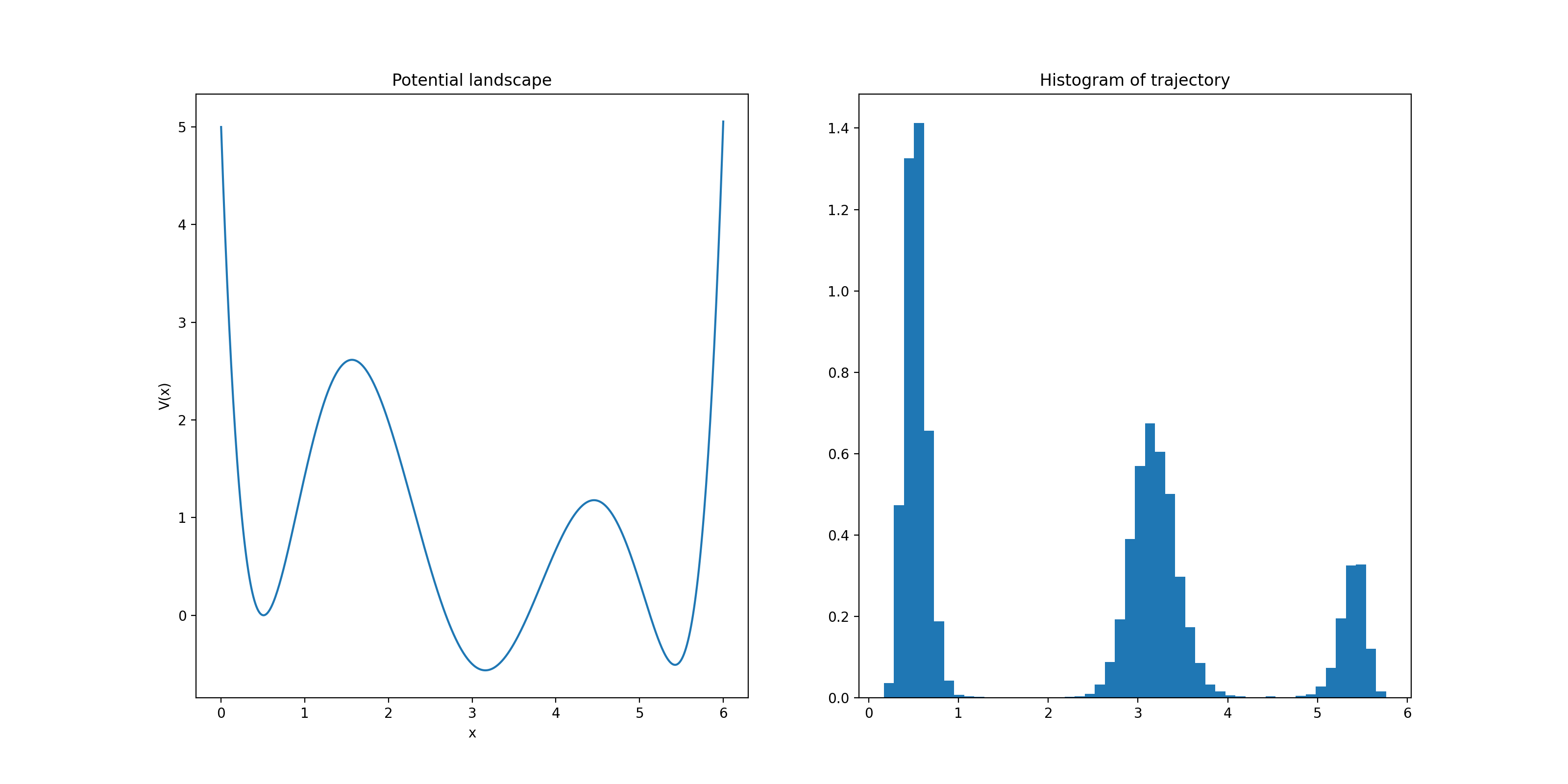 \[\mathrm{d}X_t = \nabla V(X_t) \mathrm{d}t + \sigma(t, X_t)\mathrm{d}W_t\]with \(W_t\) being a Wiener process, \(\sigma = 0.75\), and the potential \(V\) being given by