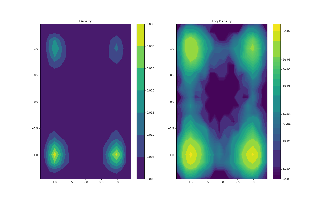 - deeptime.plots.plot_density(x, y, n_bins=100, weights=None, avoid_zero_counts=False, contourf_kws=None, ax=None)¶